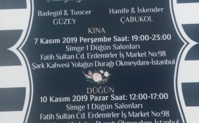 DÜĞÜN: 10 Kasım 2019 Pazar Saat:12:00 – 17:00