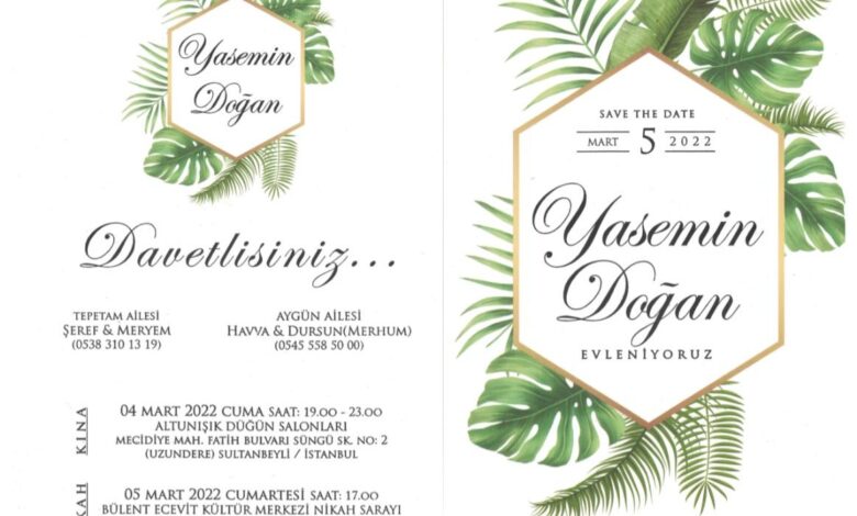 KINA: 04.03.2022 Cuma Saat 19:00 – 23:00 Altunışık Düğün Salonları